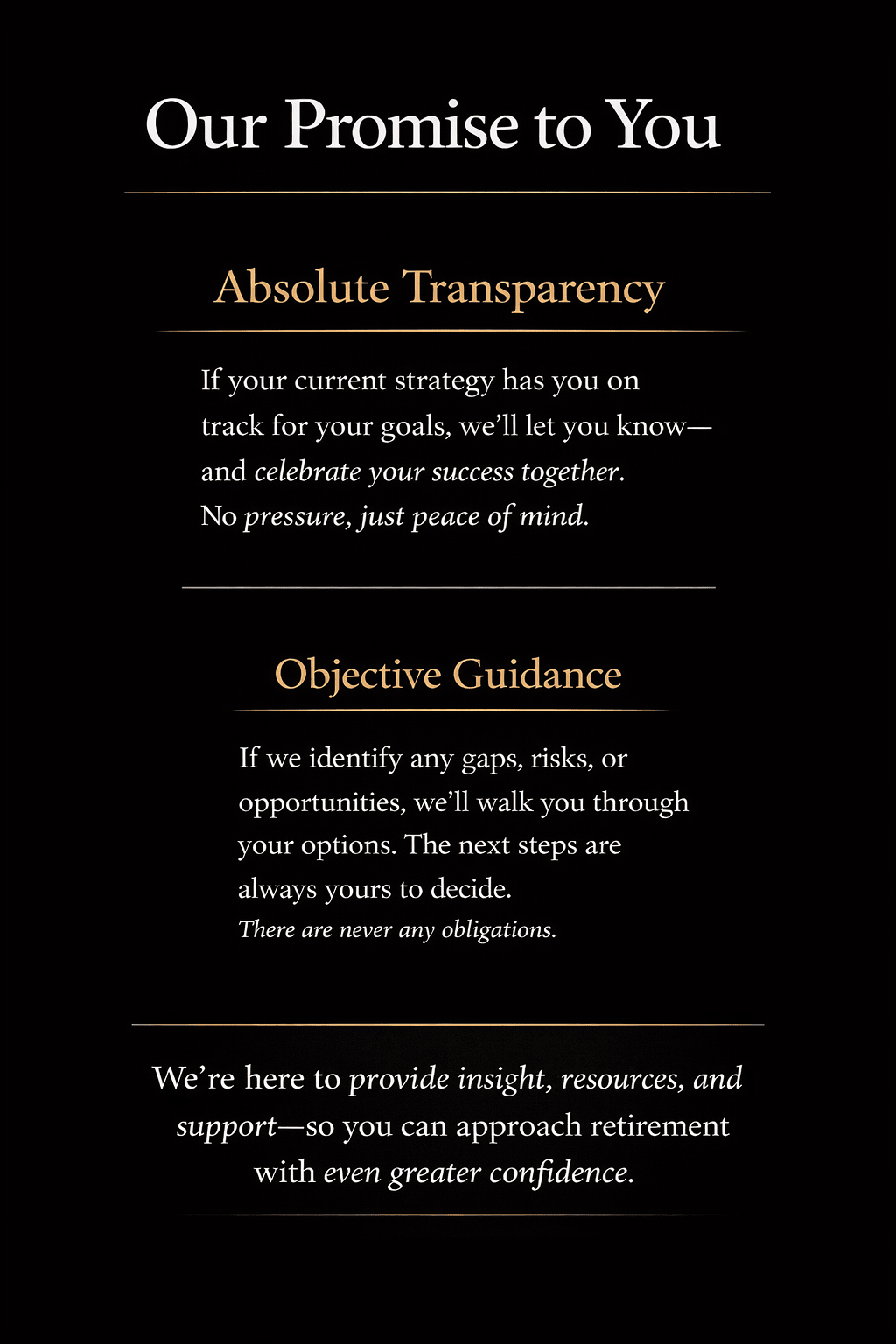 After our initial conversation, we’ll prepare and walk you through your custom-designed retirement blueprint. This isn’t a standard plan—it’s a tailored, actionable roadmap made just for you. You’ll discover where you stand today, which areas need attention, and the steps that can help you move toward retirement with clarity and confidence.