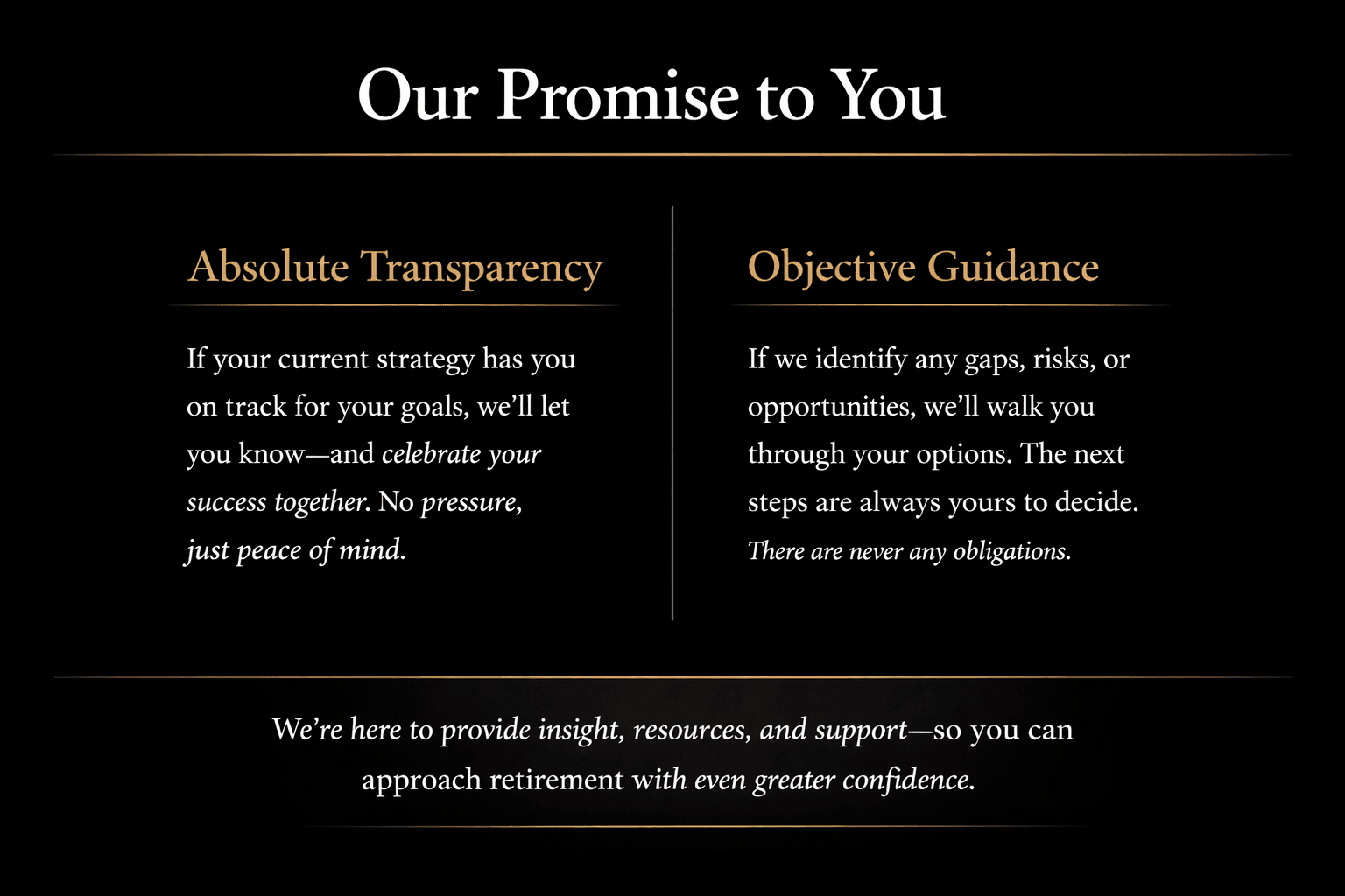 We’re excited to offer you a clear, no-obligation look at your financial future with our exclusive two-step consultation process—completely complimentary.